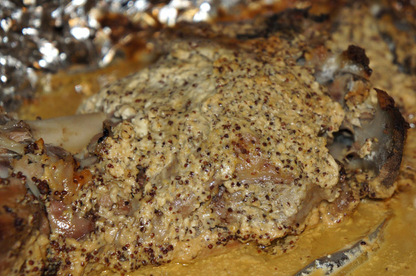 - Обмазать баранину с двух сторон смесью сметаны с зерновой горчицей и герметично упаковать в фольгу.