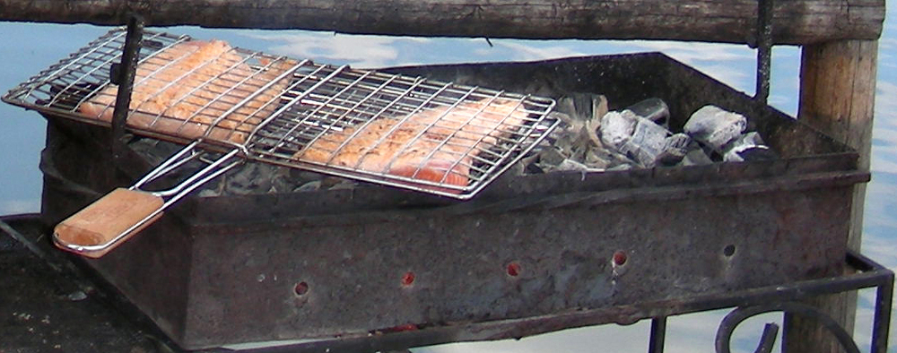 - Взять решетку для рыбы, уложить в нее филе семги и обжарить на углях.