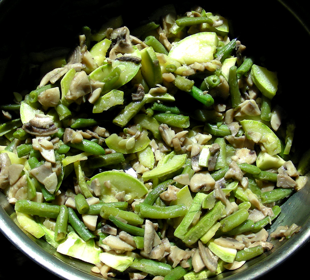 - Разогреть сковородку с растительным маслом, положить в нее фасоль, обжарить минут 5-7, добавить кабачок и грибы, тушить минут 20-25 помешивая.